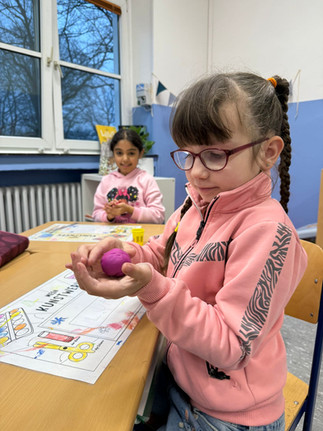 Zum Abschluss der Einheit wurde es dann richtig kreativ: Mit Knete und Schaschlikspießen bauten die Schülerinnen und Schüler die verschiedenen Körper eigenständig nach. Dabei zeigte die Klasse nicht nur mathematisches Verständnis, sondern auch tollen Teamgeist. Alle arbeiteten konzentriert zusammen, halfen sich gegenseitig und hatten sichtbar viel Spaß beim Formen, Rollen und Bauen.